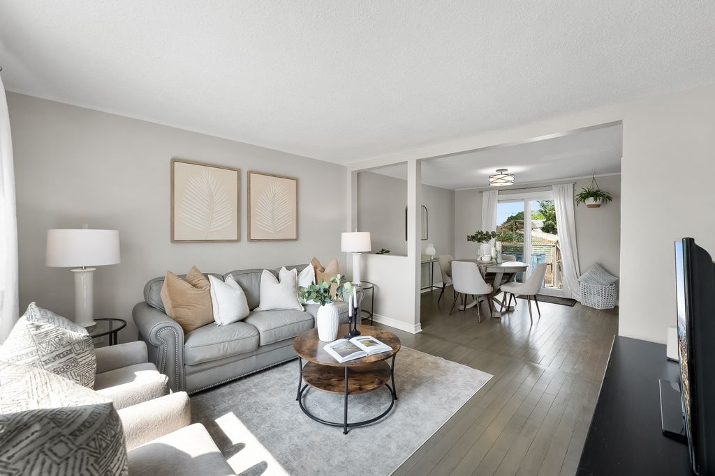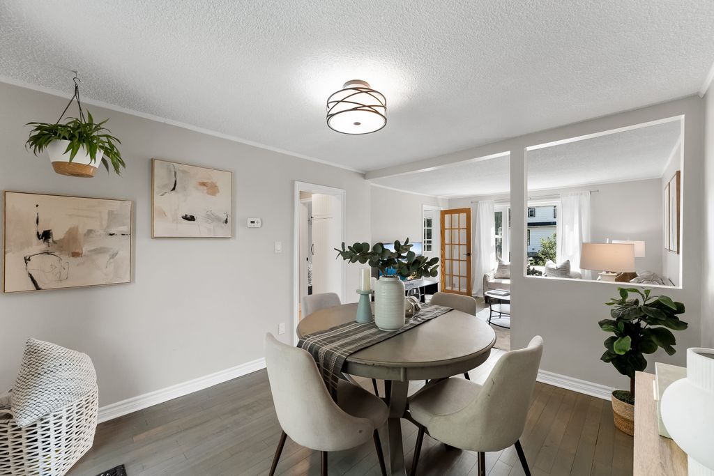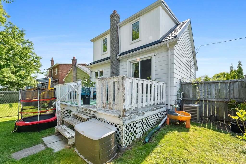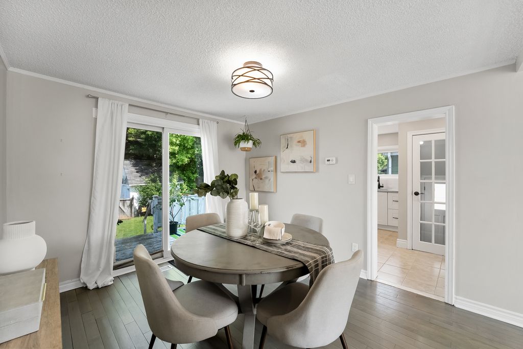 The main floor features a modern kitchen with new countertops, sink, backsplash, and sleek pot lights, opening to a combined living and dining area with refinished hardwood floors. Freshly painted throughout, the home feels bright, clean, and welcoming. Patio doors off the dining room lead to a generous deck and fully fenced backyard—an ideal space for entertaining or relaxing outdoors.