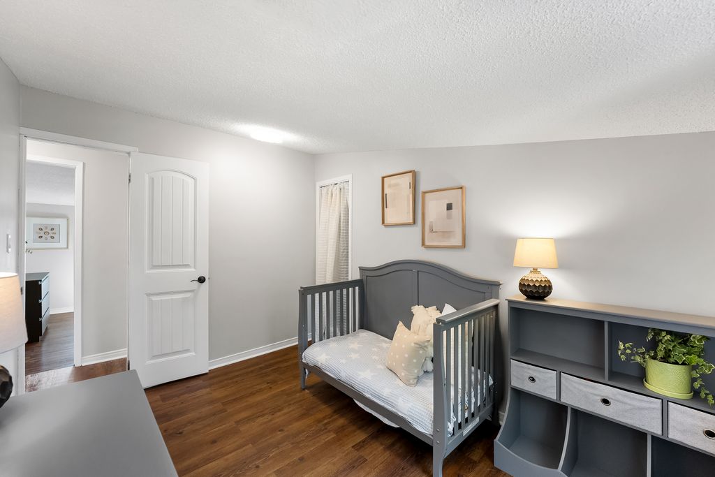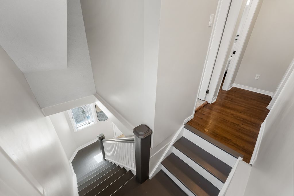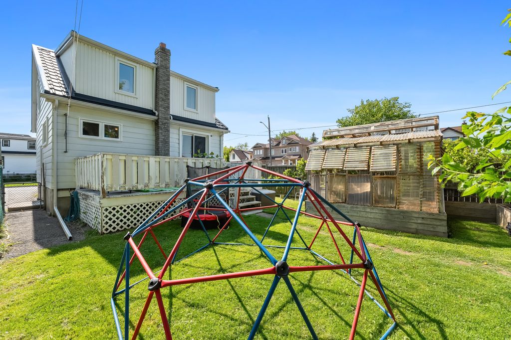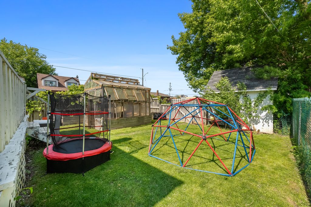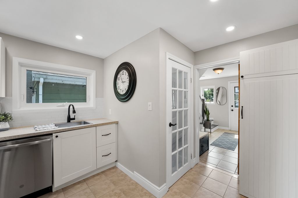The main floor features a modern kitchen with new countertops, sink, backsplash, and sleek pot lights, opening to a combined living and dining area with refinished hardwood floors. Freshly painted throughout, the home feels bright, clean, and welcoming. Patio doors off the dining room lead to a generous deck and fully fenced backyard—an ideal space for entertaining or relaxing outdoors.